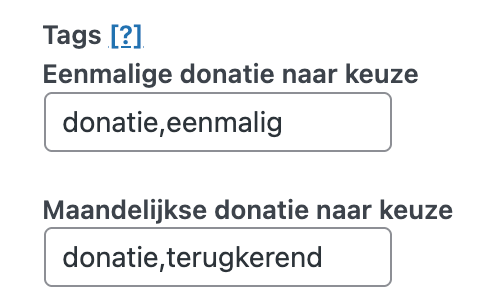 In de MailChimp instellingen van het formulier kun je 1 of meerdere tags per prijsoptie instellen. Meerdere tags kun je scheiden door middel van een komma.